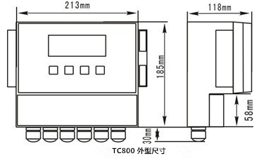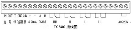 TC800分體壁掛式圖形超聲波液(物)位計安裝尺寸圖及接線圖。